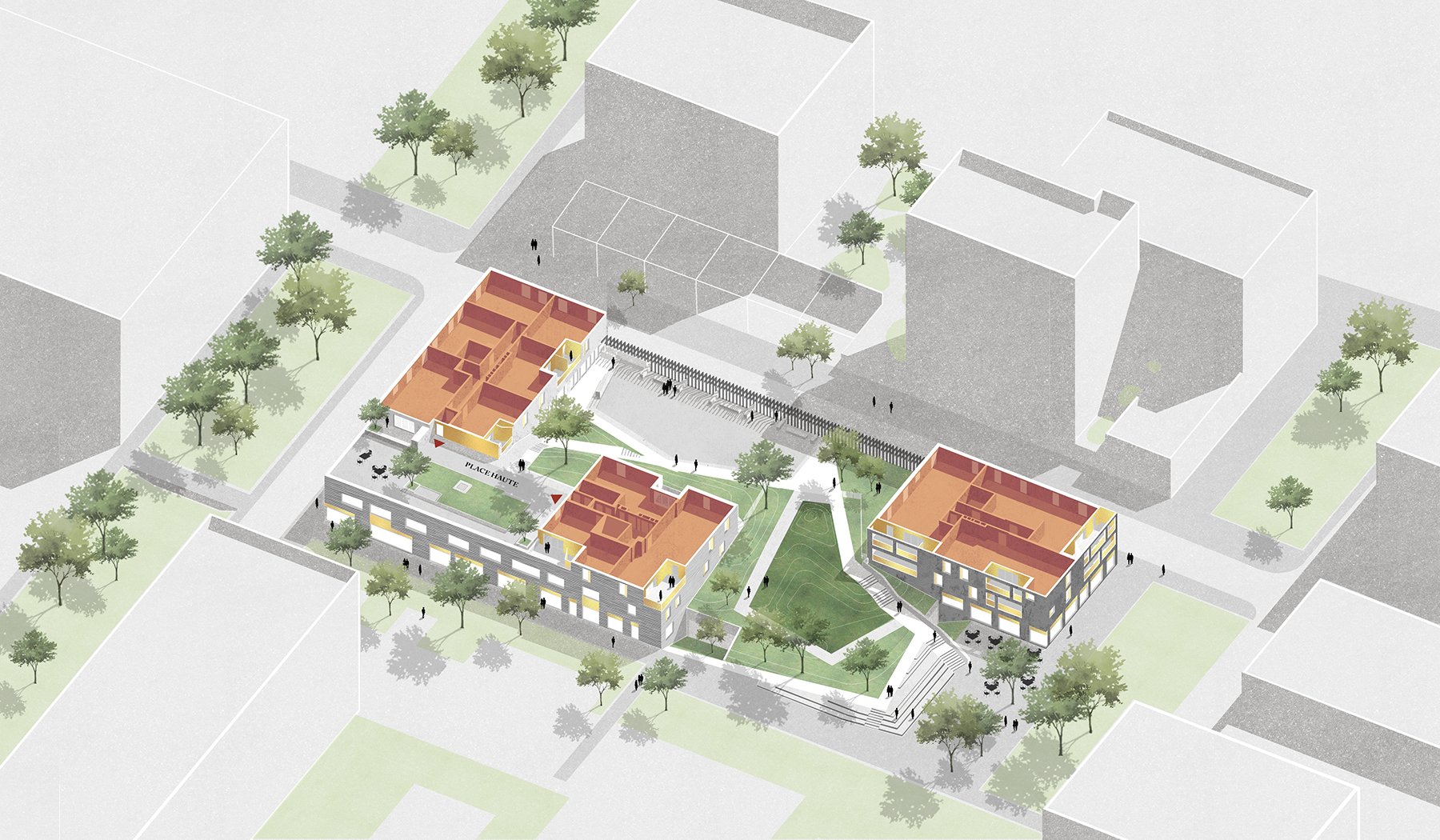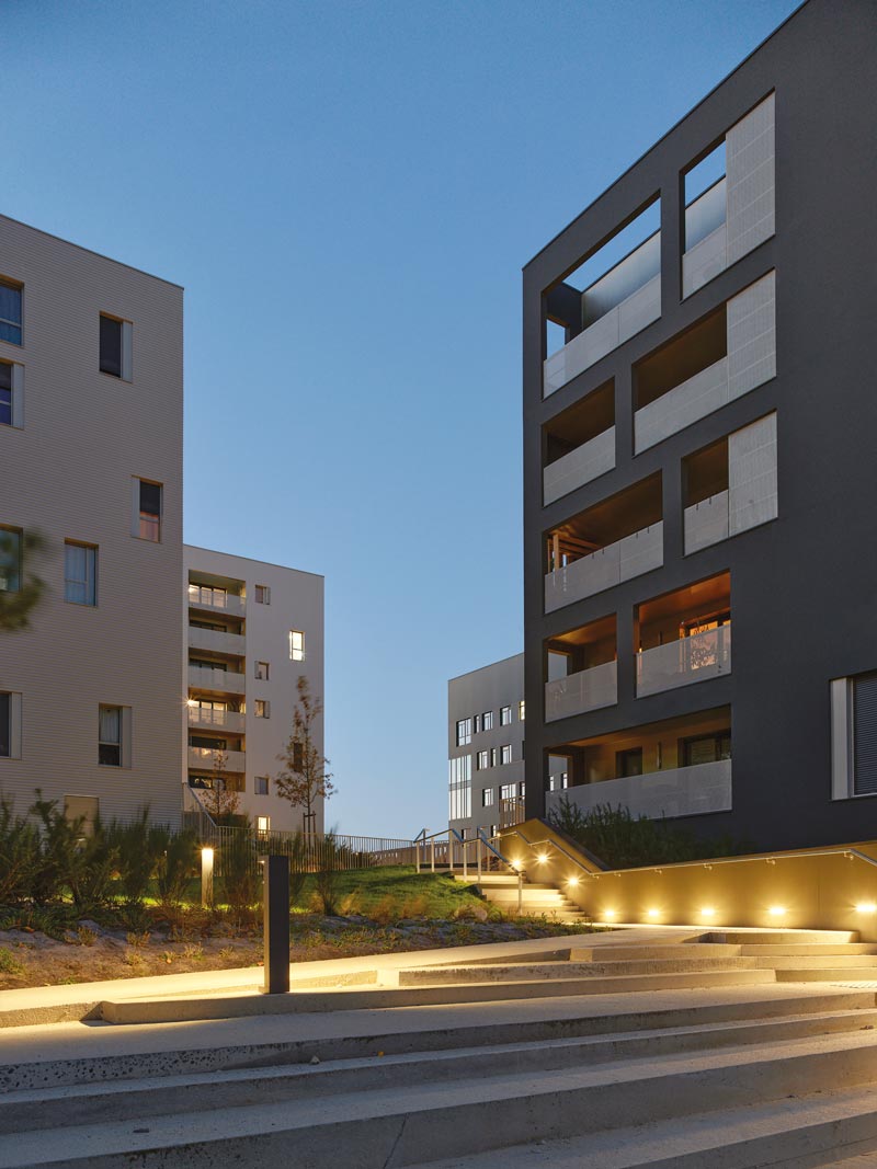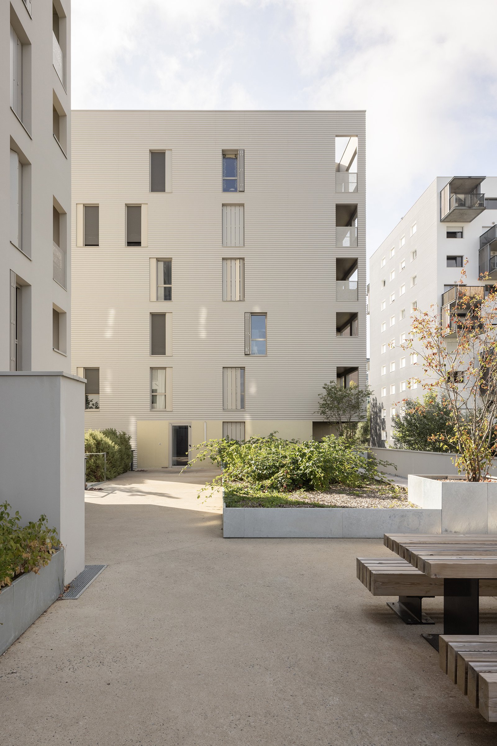 Les aménagements extérieurs s’organisent autour de deux espaces majeurs : une placette urbaine située au niveau de la rue dans le prolongement des espaces publics du quartier et une place haute, à l’usage des habitants. L’enjeu du projet est de lier ces espaces de manière à créer une continuité physique et visuelle depuis l’espace public jusqu’aux logements.
