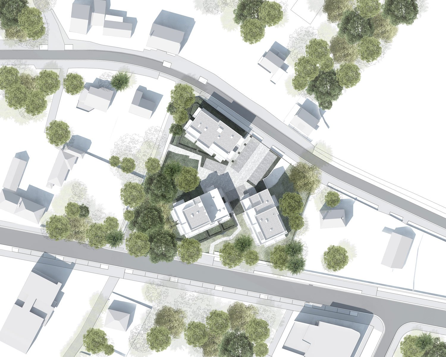 L’implantation des bâtiments est prévue pour aménager un espace central distribuant les bâtiments. Un niveau commun étant proposé pour le rez-de-chaussée des trois bâtiments. L’ensemble s’inscrit dans le dénivelé du terrain naturel pour limiter les modifications sur le profil altimétrique.